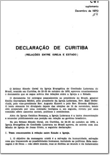 n. 24, dez. 1970. Declaração de Curitiba (Relações entre Igreja e Estado) o Sétimo S1nodo Geral da Igreja Evangélica de Confissão Luterana do Brasil, reunido em Curitiba, de 22-25 de outubro de 1970, aprovou unanimemente o documento que se segue acerca das relações entre a Igreja e o Estado. |