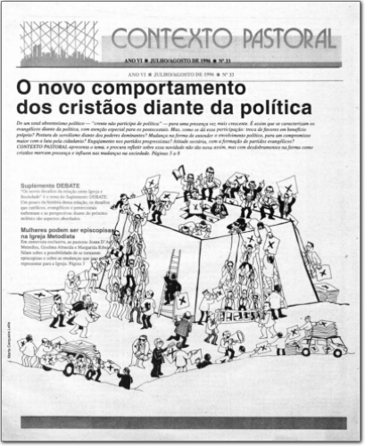 n. 33, jul./ago. 1996. CONTEXTO PASTORAL dá continuidade ao propósto de resgatar a memória ecumênica brasileira e reproduz o estrato de um texto publicado em outubro de 1967 no suplemento do boletim CEI (Centro Ecumênico de Informação). O autor, o pastor da Igreja Evangélica de COnfissão Luterana no Brasil, Breno Schumann, morreu em um acidente automobilístico em 1972 aos 34 anos, o que representou uma lacuna para o movimento ecumênico no Brasil. O resgate de parcela desta produção é um convite aos leitores para que percebam a atualidade desta reflexão, produzida numa conjuntura adversa: em plena ditadura militar. (continuação na página 11). |