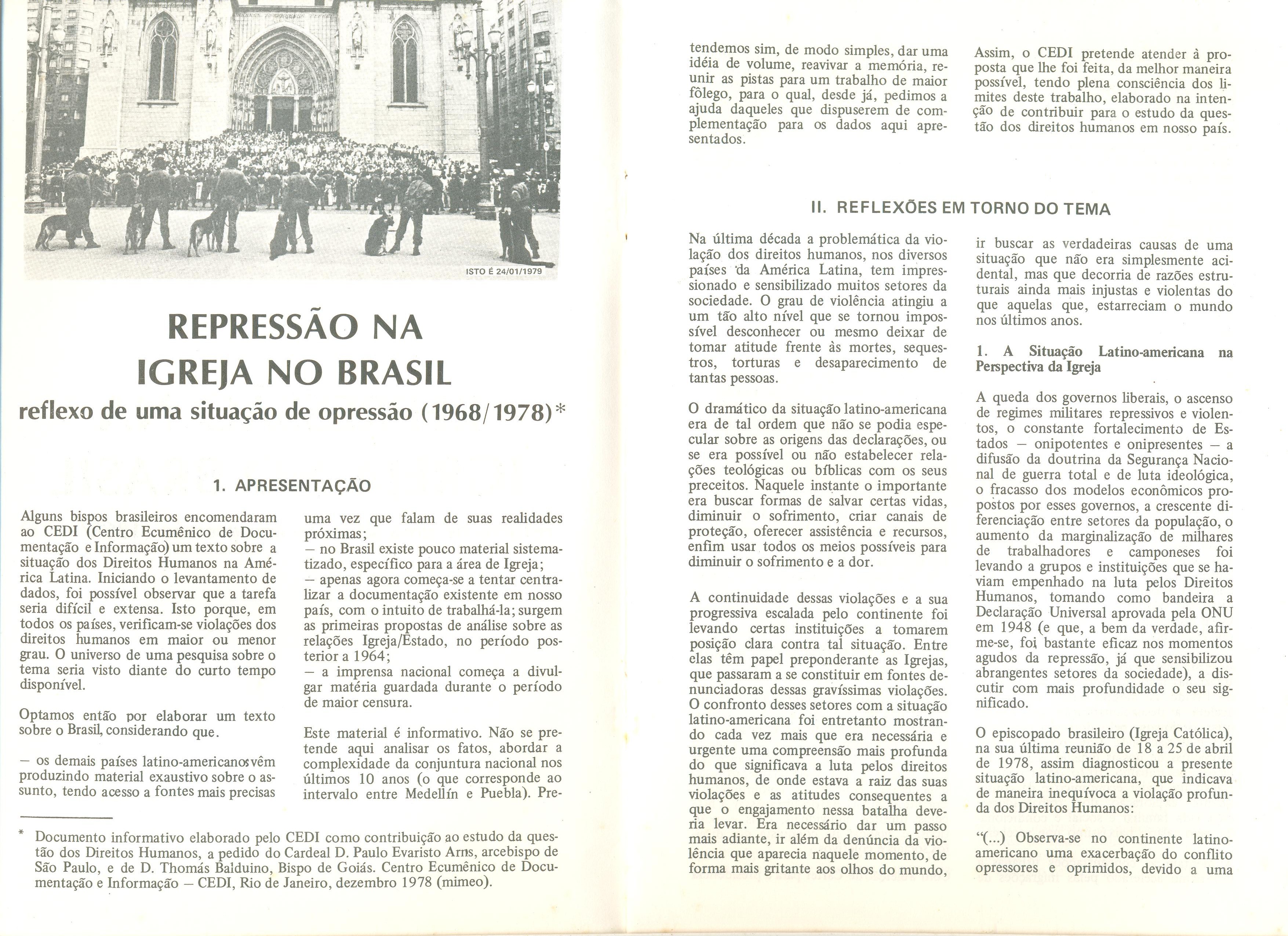 Dezembro. 1978. (arquivo 1) Documento informativo elaborado pelo CEDI (Centro Ecumênico de Documentação e Informação) como contribuição ao estudo da questão dos Direitos Humanos, a pedido do Cardeal D. Paulo Evaristo Arns, arcebispo de São Paulo, e D. Thomás Balduino, Bispo de Goiás. |