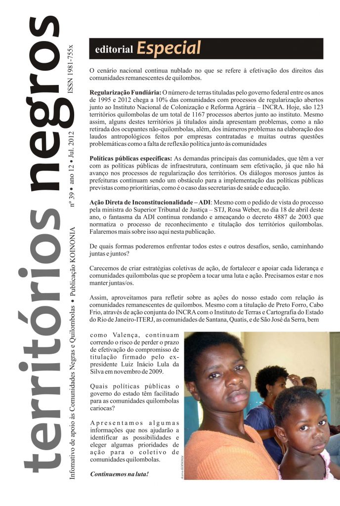 Divulga notícias sobre comunidades remanescentes de quilombos de todo o Brasil, reunindo matérias publicadas no portal Observatório Quilombola e informações enviadas por quilombolas e pesquisadores. O periódico – publicado desde 2001 – visa contribuir para o fortalecimento da rede de informações entre as comunidades, favorecendo a luta pela identificação e reconhecimento oficial desses territórios.