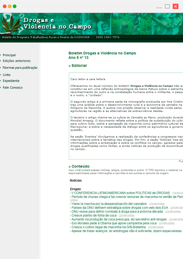 Aborda a conjuntura da economia política das drogas no Brasil, com ênfase na zona rural, reunindo artigos, entrevistas e notícias. Análises sobre áreas de cultivo da maconha, políticas públicas relacionadas às drogas e direitos humanos e reflexões sobre a atuação latino-americana dos movimentos sociais de cocaleros são alguns dos temas desta publicação eletrônica, vinculada ao programa Trabalhadores Rurais e Direitos.