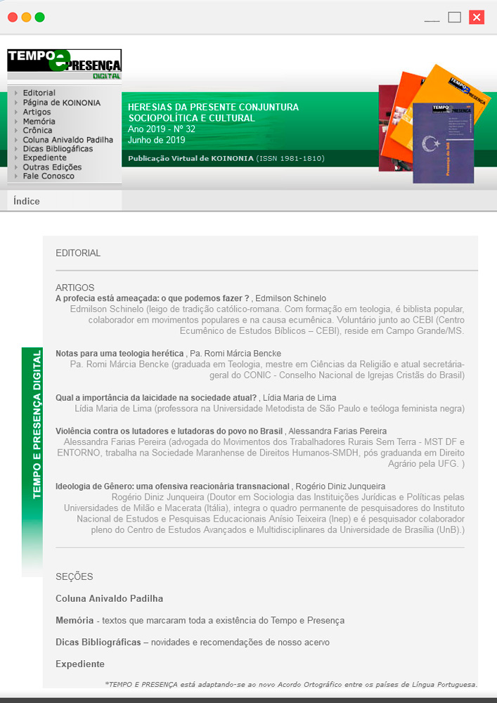 Revista eletrônica bimestral editada por KOINONIA com a proposta de produzir e divulgar análises dos panoramas sociopolítico, econômico, cultural e religioso, nos planos nacional e internacional, numa perspectiva ecumênica. Editada desde 1979, a partir de 2006, Tempo & Presença passou a ser editada em versão eletrônica, no site de KOINONIA.